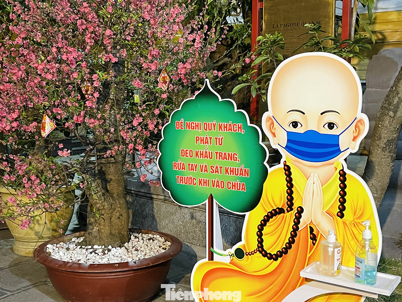 Do ảnh hưởng của dịch COVID-19 nên ngay cổng vào chùa Quán Sứ đã có biển thông báo: 'các phật tử cần đeo khẩu trang, rửa tay, sát khuẩn trước khi vào chùa hành lễ'.