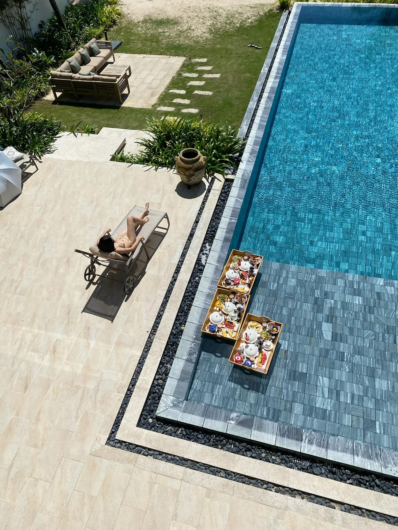 Người đẹp thả mình thư giãn bên cạnh làn nước trong xanh.