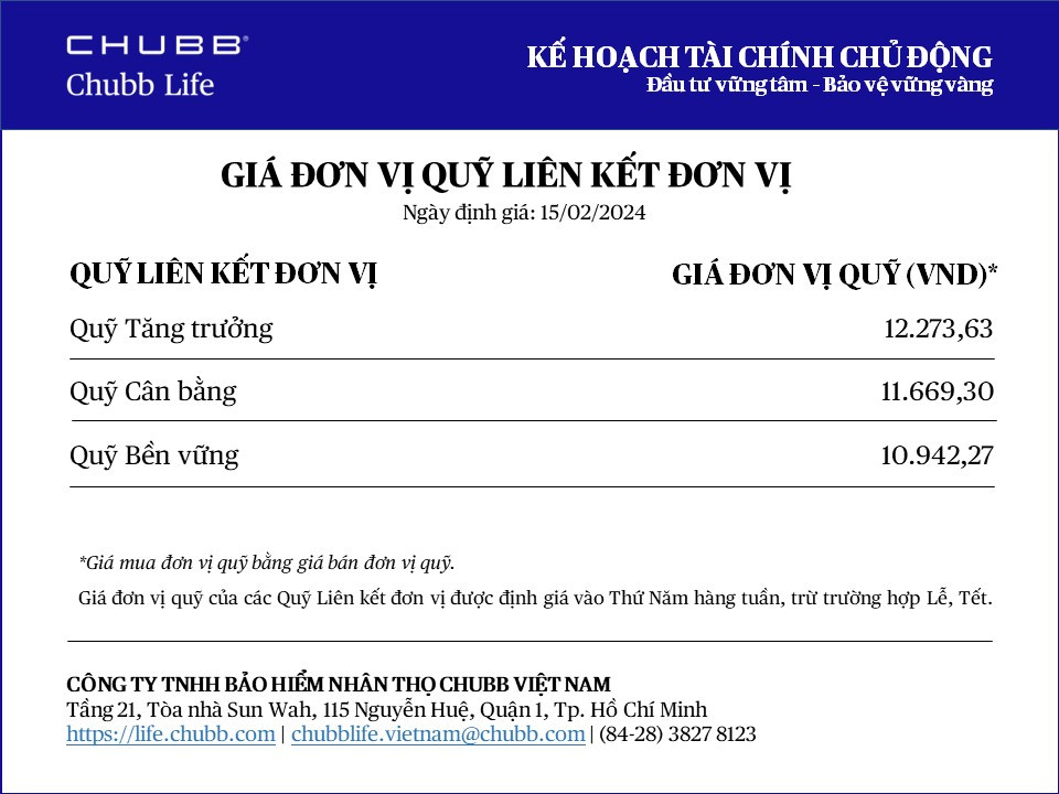 Chubb Life cập nhật giá đơn vị Quỹ Liên kết Đơn vị - Sản phẩm Kế hoạch Tài chính Chủ động