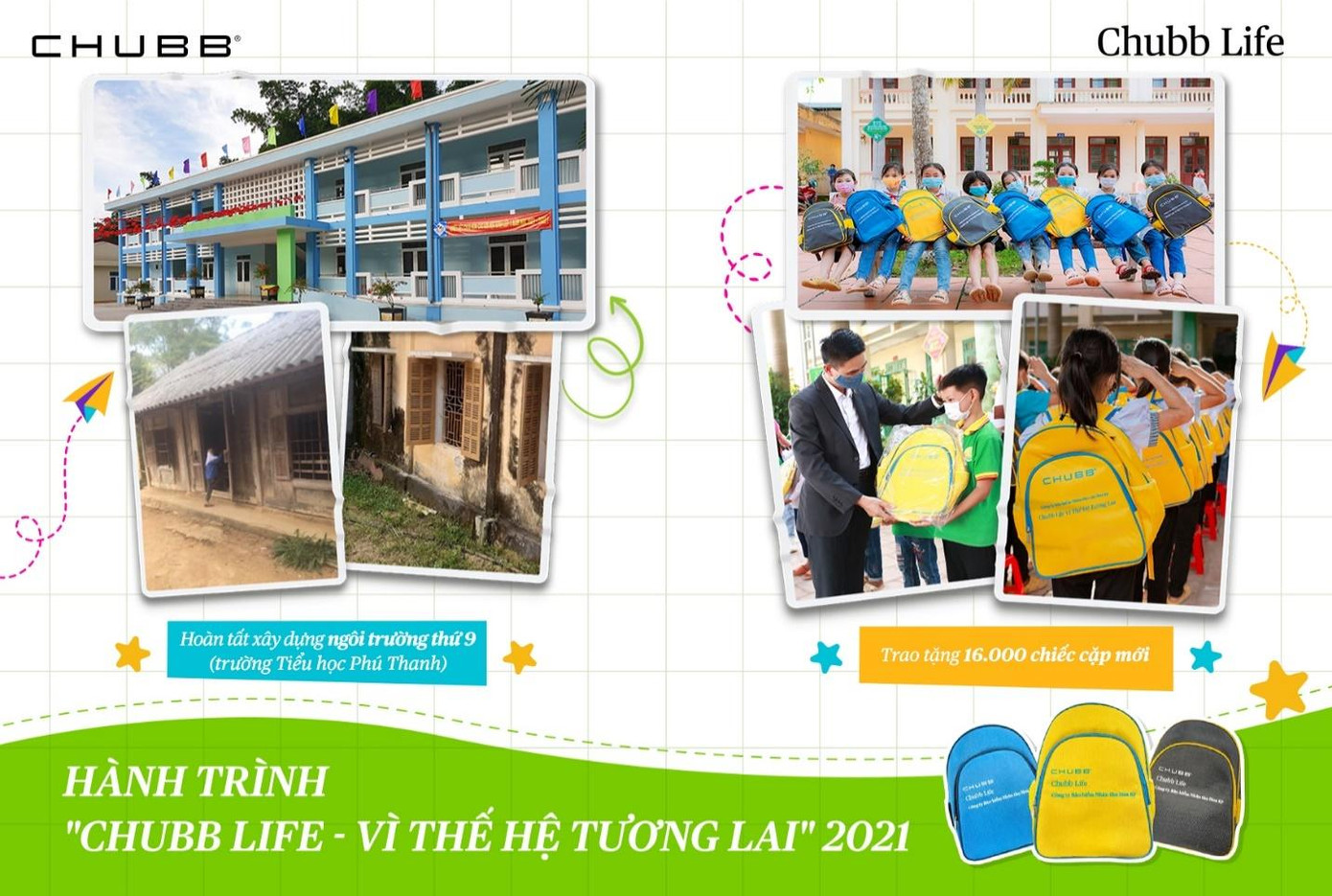 • Cùng quỹ thiện nguyện Chubb Charitable Foundation – International, Chubb Life Việt Nam đã đóng góp hơn 31 tỷ đồng để xây mới 9 ngôi trường cho trẻ em miền Trung trong những năm vừa qua. Trong năm 2021, ngôi trường thứ 9 – trường tiểu học Phú Thanh, Quan Hóa, Thanh Hóa đã hoàn tất và có thể đi vào hoạt động trong năm học mới 2021-2022.