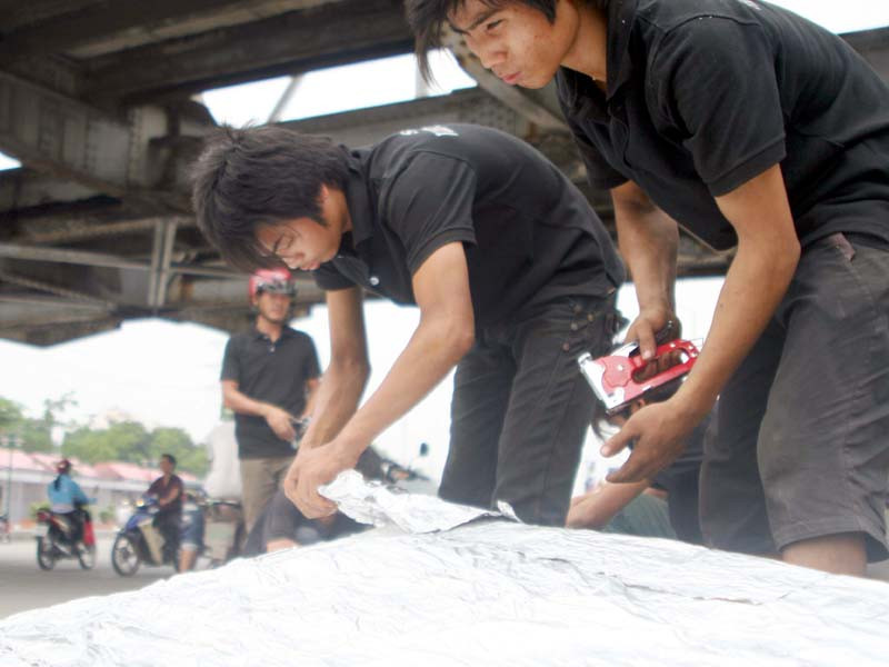 Những công nhân của công ty Viet brother đang làm tiếp những chiếc vẩy rồng để dựng nên một con rồng xuyên suốt chiều dài của cầu.