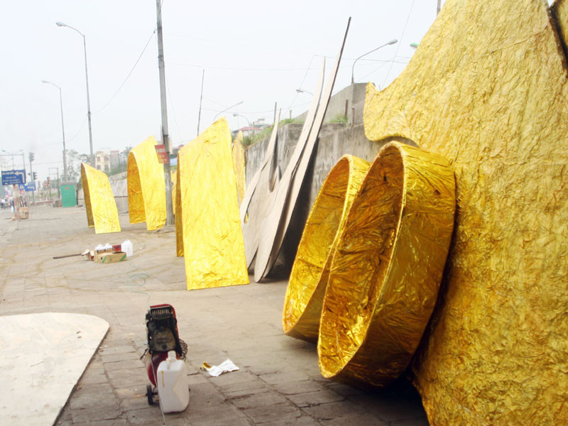 Những chiếc vẩy rồng và đầu rồng, điểm nhấn của ngày hội đã hoàn thành phần thô, chỉ chờ lắp ráp.