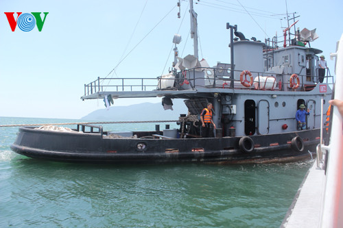 Hai nhân viên kiểm ngư phải xuống biển, bơi ra tàu bị nạn buộc rất nhiều dây thừng mới kéo chậm đưa vào cảng Đà Nẵng