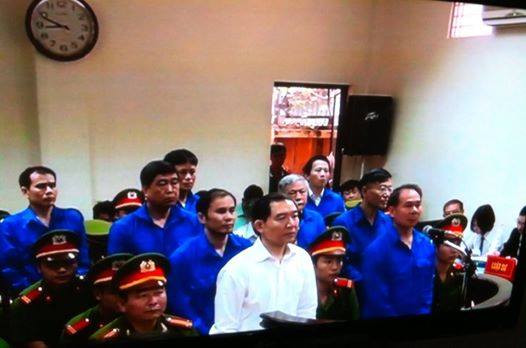 9 bị cáo đã xong phần kiểm tra căn cước. Hội đồng xét xử chuẩn bị xét xử phúc thẩm các bị cáo. Ảnh: Bảo Thắng