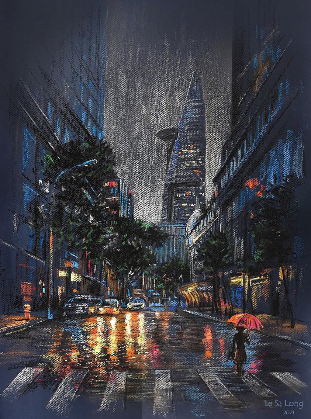 Khu Ngô Đức Kế- quận 1 trung tâm TP sầm uất nhộn nhịp với nhiều nhà hàng quán Bar, thế mà khi có dịch tràn đến, chỉ có vài ánh đèn vàng le lói dưới cơn mưa đêm! Bóng người cầm dù cô đơn quá!