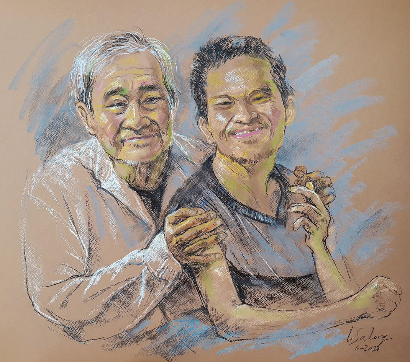 Tôi vẽ ông Hưng với hình anh đôi tay ôm hai vai tài như muốn che chở con, Còn Tài thì cười và chỉ vào ba như muốn nói: “Người cha vĩ đại của tui đó!”.