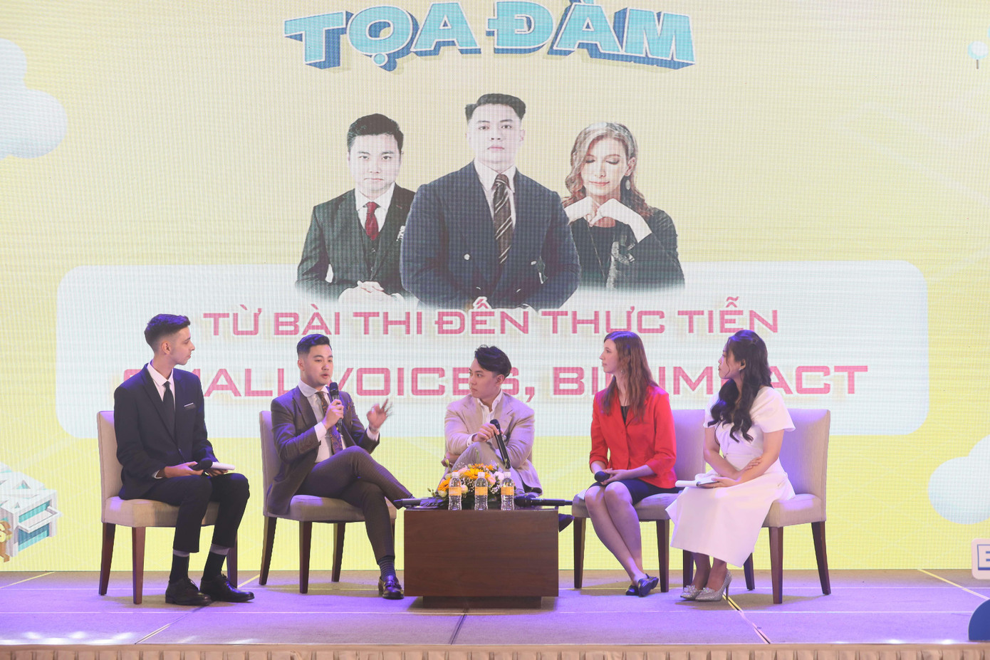 Tiếp theo chương trình là buổi tọa đàm với chủ đề “Từ bài thi đến thực tiễn: Small voices, Big impact” là những chia sẻ quý báu đến từ thầy giáo Đặng Trần Tùng, diễn giả Michael Lưu và chuyên gia IDP Sarah Matthews về những vấn đề trong kỳ thi Ielts để các bạn trẻ có đủ sự chuẩn bị kỹ càng nhất cho kỳ thi khốc liệt này.