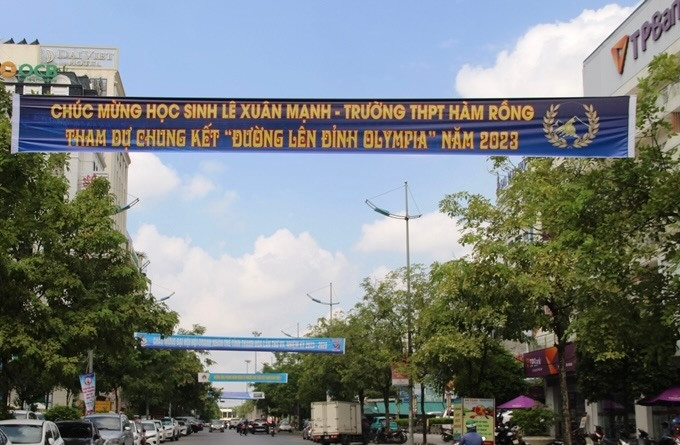 | Đây được xem là sự kiện thu hút sự chú ý lớn của người dân, học sinh thành phố Thanh Hóa. Băng rôn cổ vũ em Lê Xuân Mạnh được treo trên nhiều tuyến đường của TP Thanh Hóa. |