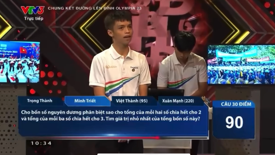 Câu hỏi 30 điểm của Minh Triết sẽ là "quân bài cứu" cho Trọng Thành nếu cậu trả lời chính xác, giành lại ngôi vị dẫn đầu từ tay Xuân Mạnh. Tuy nhiên, nam sinh THPT chuyên Trần Phú không đưa ra đáp án đúng.