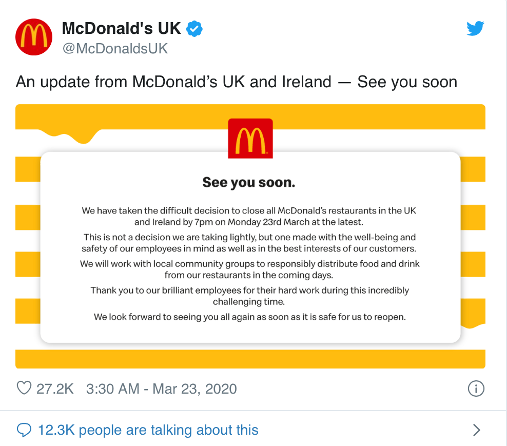 Mới đây trên Twitter, chuỗi của hàng McDonald's tại Anh cũng đưa ra thông báo: "Chúng tôi đã rất khó để đưa ra quyết định đóng toàn bộ chuỗi cửa hàng McDonald's tại Anh và Ireland từ 7h tối ngày thứ Hai 23/3. Đây không phải là một quyết định dễ dàng nhưng quyết định này sẽ là điều tốt nhất và đảm bảo an toàn cho nhân viên và khách hàng của chúng tôi. Chúng tôi sẽ làm việc cùng với chính quyền địa phương để chịu trách nhiệm phân phối đồ ăn và thức uống của nhà hàng trong một vài ngày tới. Cảm ơn các nhân viên xuất sắc của McDonald's đã làm việc vất vả trong khoảng thời gian khó khăn này. Chúng tôi hy vọng sẽ được gặp lại các bạn khi đủ an toàn để có thể hoạt động trở lại".