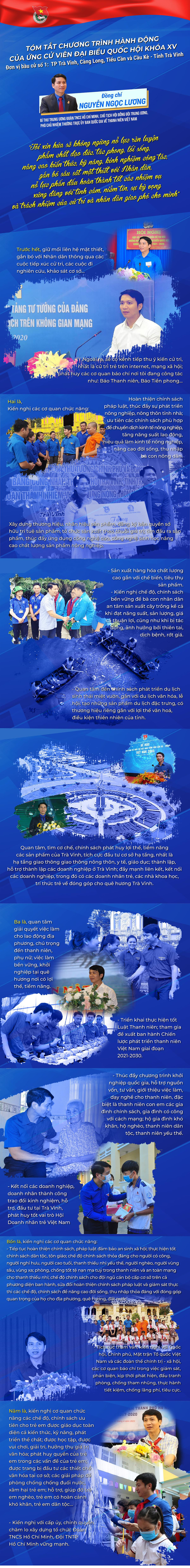 TPO - Trong chương trình hành động của mình, ứng cử viên Đại biểu Quốc hội Nguyễn Ngọc Lương khẳng định đặc biệt quan tâm, tìm cơ chế, chính sách phát huy lợi thế, tiềm năng các sản phẩm của Trà Vinh, tích cực đầu tư cơ sở hạ tầng, nhất là hạ tầng giao thông giao thông nông thôn, y tế, giáo dục; thành lập, hỗ trợ thành lập các doanh nghiệp ở Trà Vinh; đẩy mạnh liên kết, kết nối các doanh nghiệp, trong đó có các doanh nhân trẻ, các nhà khoa học, trí thức trẻ về đóng góp cho quê hương Trà Vinh.