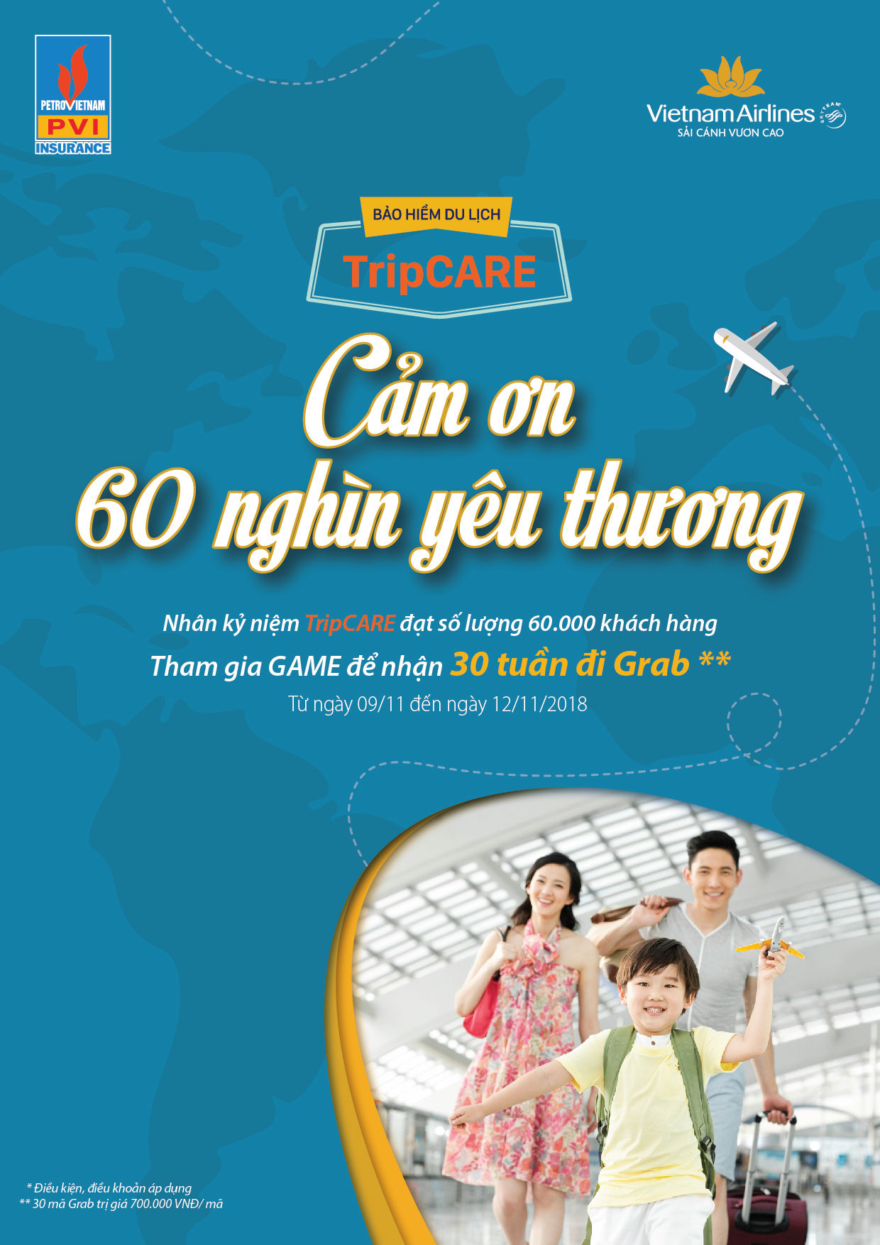 Bảo hiểm Du lịch TripCARE chính thức ra mắt từ tháng 10/2017. Sau hơn 1 năm sản phẩm bảo hiểm du lịch toàn diện do Bảo hiểm PVI và Vietnam Airlines phối hợp cung cấp đã nhận được sự tin tưởng và ủng hộ của đông đảo khách hàng. Đến đầu tháng 11/2018, đã có 66.000 hành khách của Vietnam Airlines mua Bảo hiểm Du lịch TripCARE trên website www.vietnamairlines.com. Nhằm tri ân sự tin tưởng của khách hàng, từ ngày 12/11 đến ngày 21/11/2018, 2.000 khách hàng đầu tiên mua Bảo hiểm Du lịch TripCARE cùng với vé máy bay của Vietnam Airlines trên website www.vietnamairlines.com sẽ nhận được mã GrabCar/GrabBike trị giá 40.000 đồng.