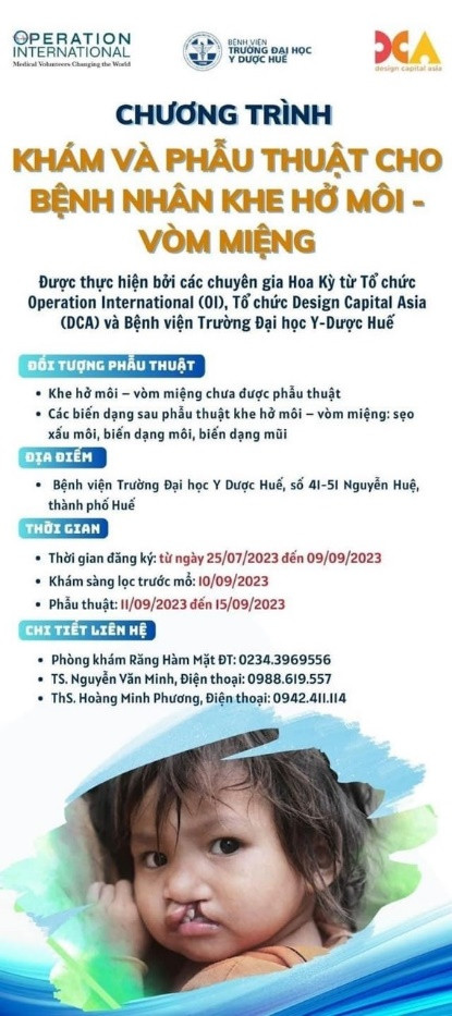 Thời gian đăng ký: 15/7-30/8/2023. Khám sàng lọc trước mổ 10/9. Phẫu thuật 11/9 – 15/9/2023.