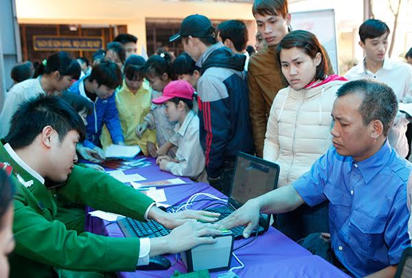 Cán bộ Công an huyện đang làm thủ tục cấp phát thẻ căn cước công dân.