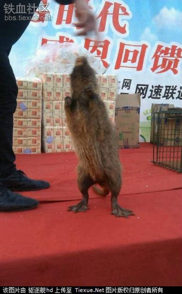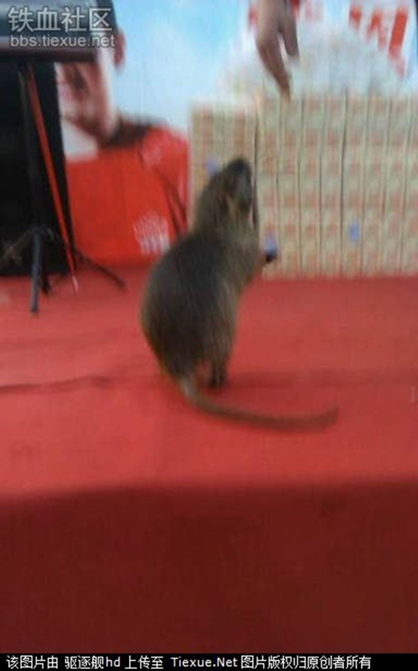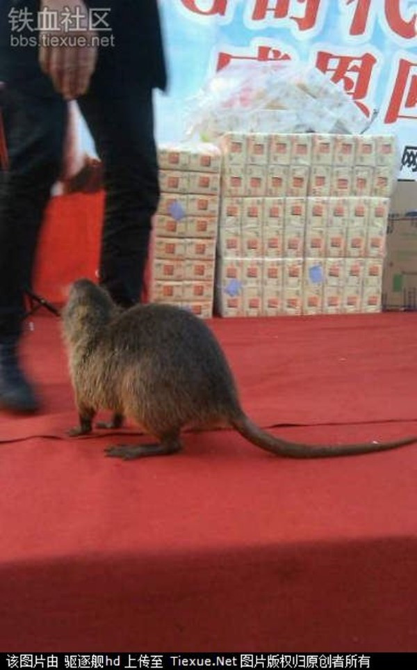Chú chuột khổng lồ này xuất hiện tại một chương trình cuối năm tại khu trung tâm mua sắm lớn thành phố Quảng Châu vào ngày 16/1 vừa qua. Lúc đứng, con chuột này có chiều cao quá đầu gối người lớn. Ngoài bộ lông màu nâu sẫm, nó còn sở hữu đôi chân to với màng kết lớn.
