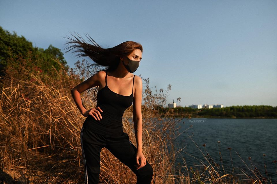 Do ở trong khu cách ly không có váy áo lộng lẫy nên siêu mẫu chỉ mặc quần thể thao, áo hai dây. Cô còn sử dụng khẩu trang làm phụ kiện.