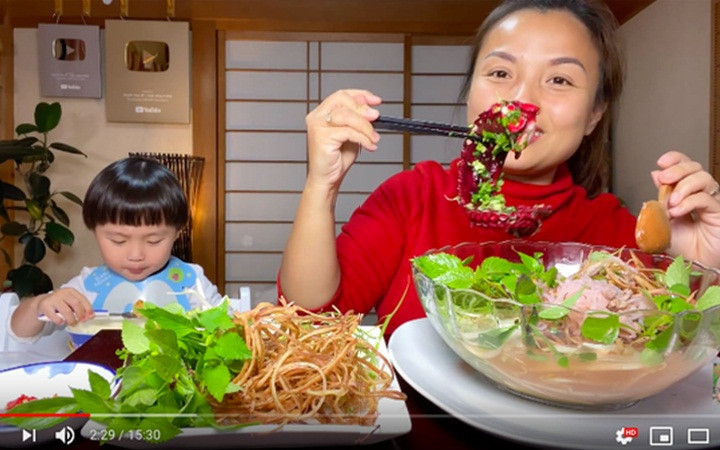 Trong khi đó, vlogger Quỳnh Trần JP - chị nội trợ kiểu mẫu đang sinh sống tại Nhật chuyên quay các video tận hưởng món ăn, thì lại đang gây sốt cộng đồng mạng. Trung bình, mỗi clip của chị hiện thu về hơn 1 triệu view. Nếu nhìn thoáng qua, những video của Quỳnh Trần JP dường như không đặc biệt bằng Bà Tân Vlog; khi bà Tân liên tục tạo ra những món siêu to khổng lồ, công việc của Quỳnh Trần JP chỉ đơn giản là… ăn và tám với chiếc điện thoại cùng cậu con trai đang ngồi ở một góc bàn.