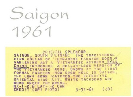 Trình bầy tại buổi trình diễn thời trang chính thức đầu tiên trước nay ở Sài Gòn. Áo dài thể hiện cái tà xẻ bên ấn tượng của phương Đông . Áo mặc với quần trắng”.