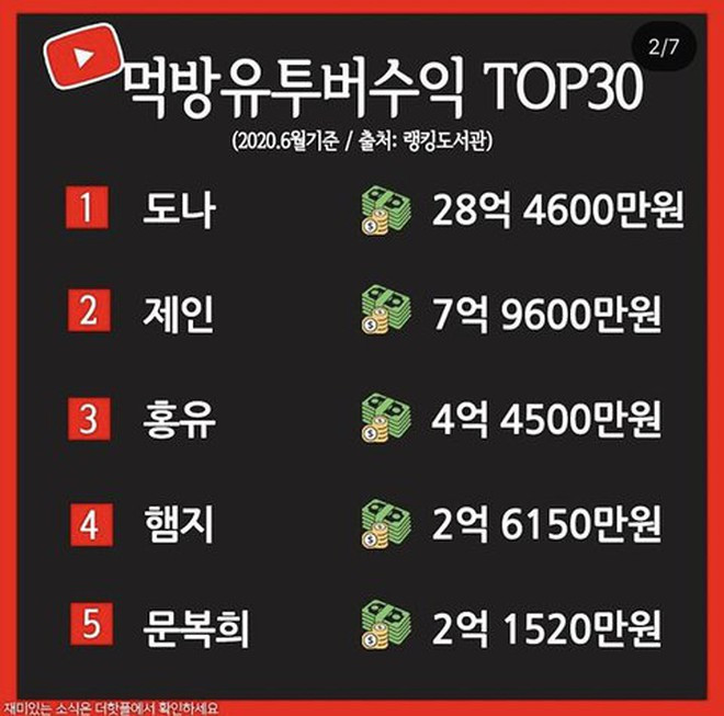 Thu nhập khủng từ việc làm mukbanger theo thống kê của Pann. Đứng đầu là DONA trên 5 triệu người theo dõi kênh YouTube với mức thu nhập 2.846 tỉ won (hơn 55 tỉ đồng).