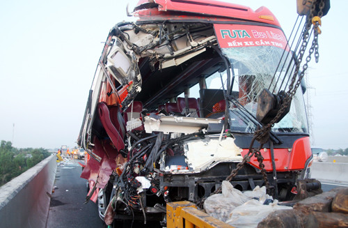 Cùng lúc, Hồ Kim Luân (35 tuổi, quê Vĩnh Long) lái ôtô khách loại 50 chỗ từ phía sau lao tới, đâm thẳng vào hai xe tải. Cú tông mạnh khiến đầu xe biến dạng, nhân viên phục vụ Nguyễn Thanh Bình (31 tuổi) chết tại chỗ.