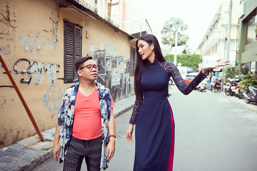 Santos Anjo đã lựa chọn cho mình một chiếc Áo dài đen với họa tiết cổ điển để có thể dạo phố cả ngày hôm nay cùng với Hoàng Thùy.