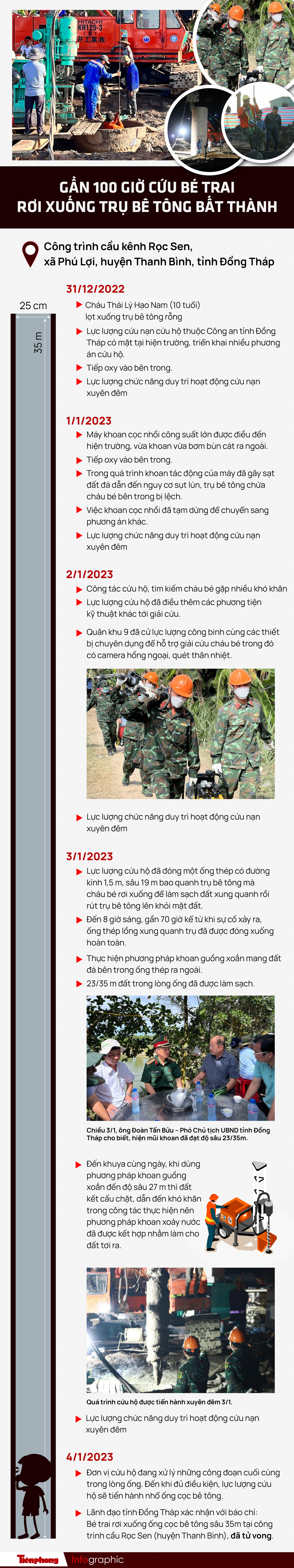 Như Tiền Phong đã đưa tin, trưa 31/12/2022, em Thái Lý Hạo Nam (10 tuổi) cùng ba người bạn vào công trình cầu Rọc Sen nằm trên đường tỉnh 857, xã Phú Lợi, huyện Thanh Bình, tỉnh Đồng Tháp, để nhặt phế liệu. Lúc đi qua công trình đang thi công, em Nam không may lọt xuống cọc bê tông rỗng bên trong, đường kính 25 cm, đã đóng xuống đất sâu khoảng 35 m. Nhận tin báo, lực lượng chức năng của địa phương đã có mặt cùng phối hợp cứu nạn.