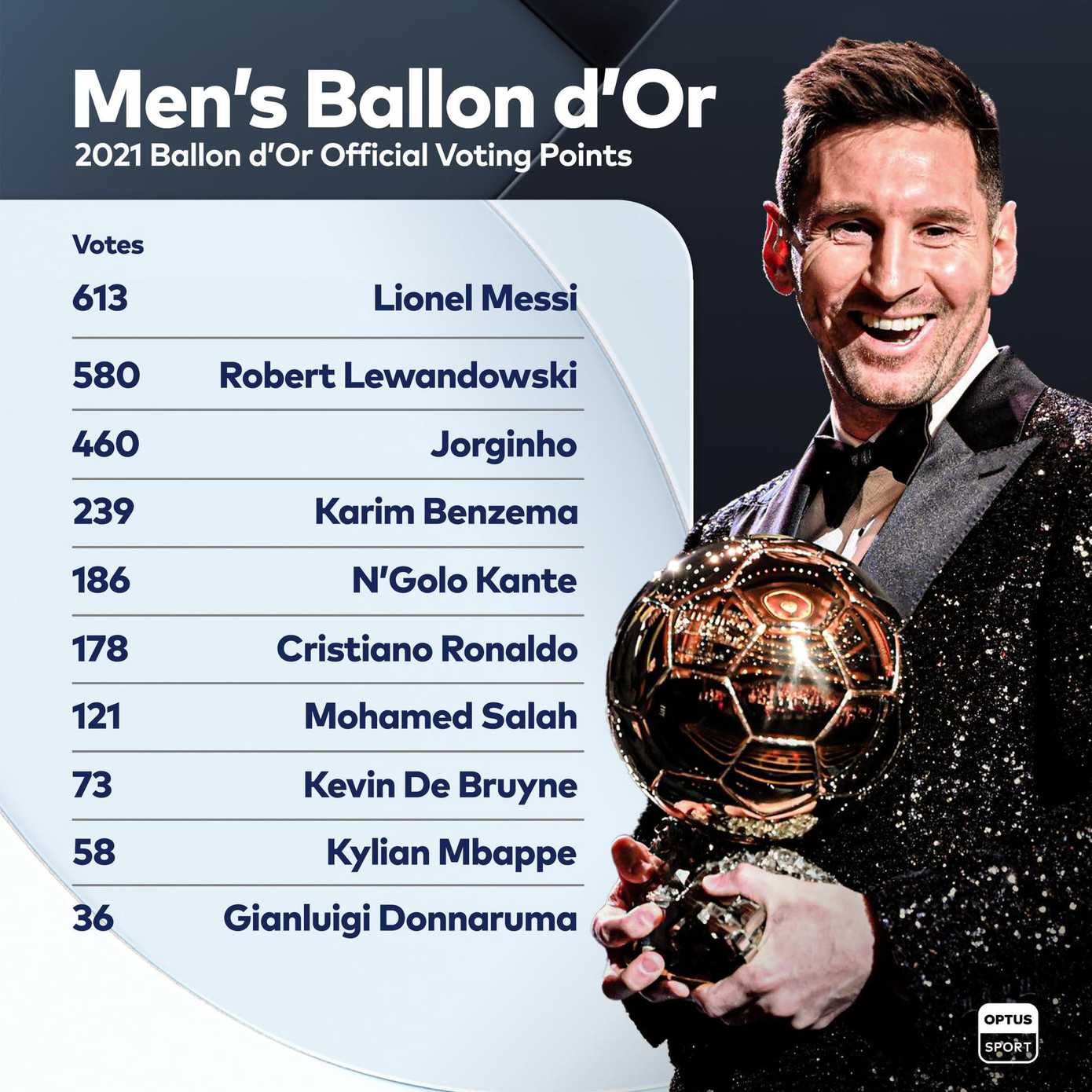Cuộc đua Quả bóng Vàng (Ballon d'Or) 2021 đã kết thúc với chiến thắng thuộc về tiền đạo khoác áo PSG Lionel Messi. Chân sút người Argentina giành giải thưởng cá nhân danh giá thứ 7 trong sự nghiệp với 613 điểm. Ngôi sao của CLB Bayern Munich và ĐT Ba Lan Lewandowski xếp ở vị trí thứ 2 với 580 điểm.