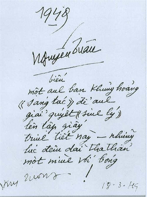 Ông buồn vì không viết được như ý, hay ông buồn vì mẹ tôi còn đang bị kẹt lại trong thành, chưa ra được chiến khu với ông? Hay cũng có lẽ cả hai? Và tôi hình dung, bác Tuân đã thật khéo động viên cha tôi khi tặng ông một cuốn sổ tay với những lời đề tặng vừa hóm hỉnh vừa cũng đầy cảm thông, khiến người nhận chỉ có thể mỉm cười: “Biếu một anh bạn khủng hoảng “sáng tác” để anh giải quyết “sinh lý” lên tập giấy trinh tiết này – những lúc đêm dài tha thẩn một mình với bóng!”.