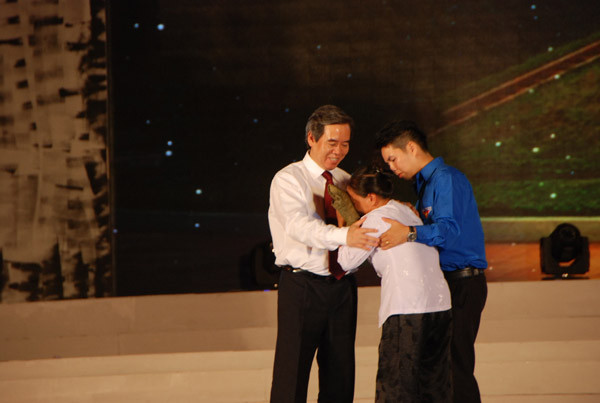 Bà Cao Thị Bé, vợ liệt sỹ Nguyễn Văn Thành xúc động nhận lại tấm chăn dù do Thống đốc Nguyễn Văn Bình trao.