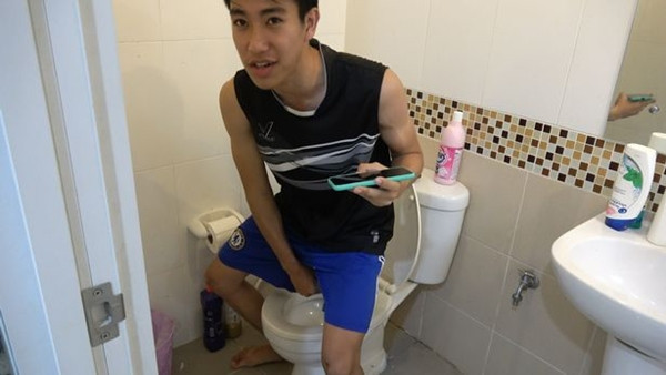 Siraphop hét lên kinh hoàng và chạy ra khỏi nhà vệ sinh, trong khi… quần vẫn chưa kéo lên.