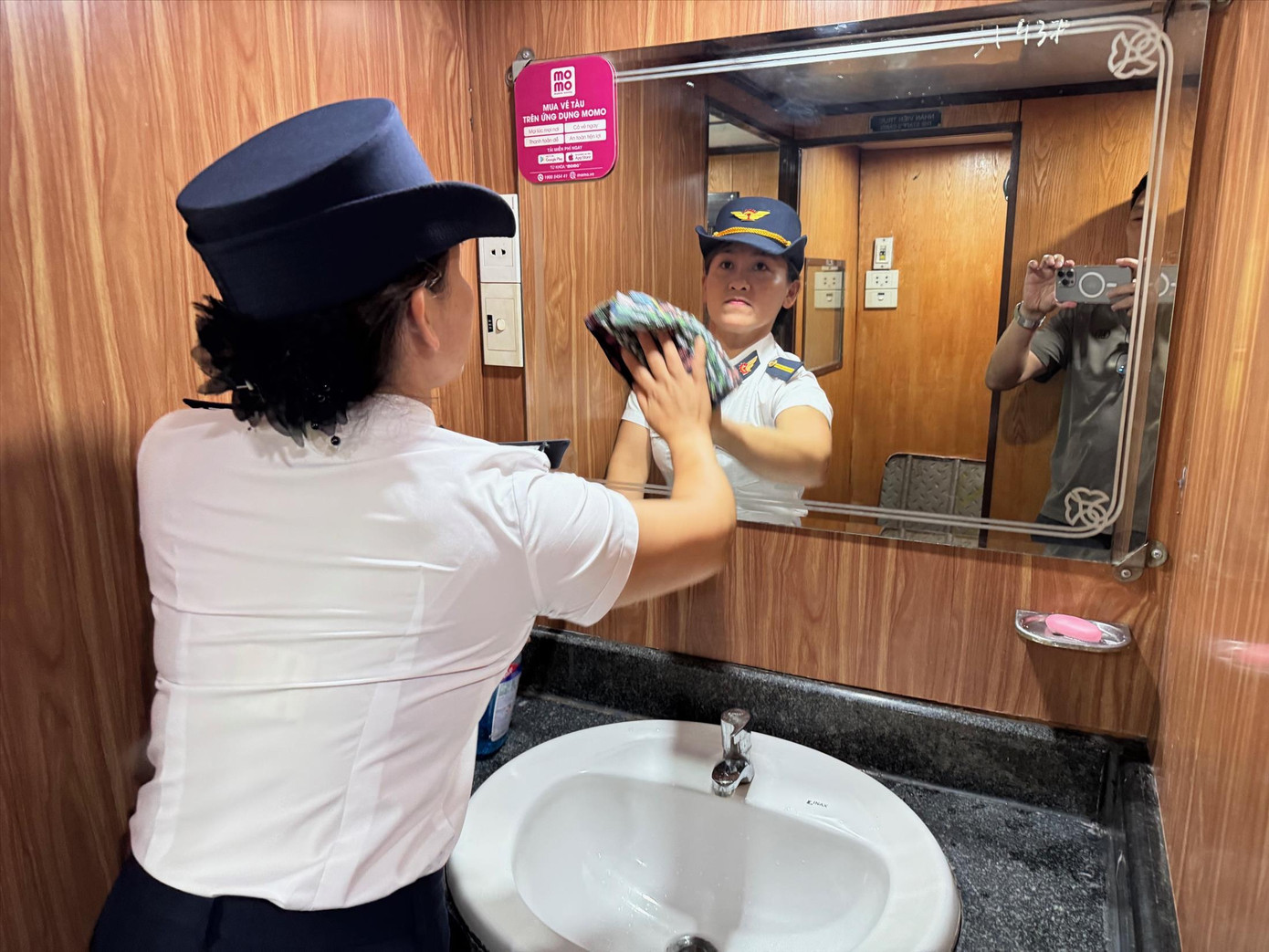 Anh thấy đó, giờ tàu đang di chuyển nhưng anh chị em trong tổ vận hành chuyến tàu vẫn tranh thủ kiểm tra, chỉnh sửa, lau chùi… để đoàn tàu được tươm tất nhất khi đón khách” - anh Nguyễn Tiến Sửu chia sẻ.