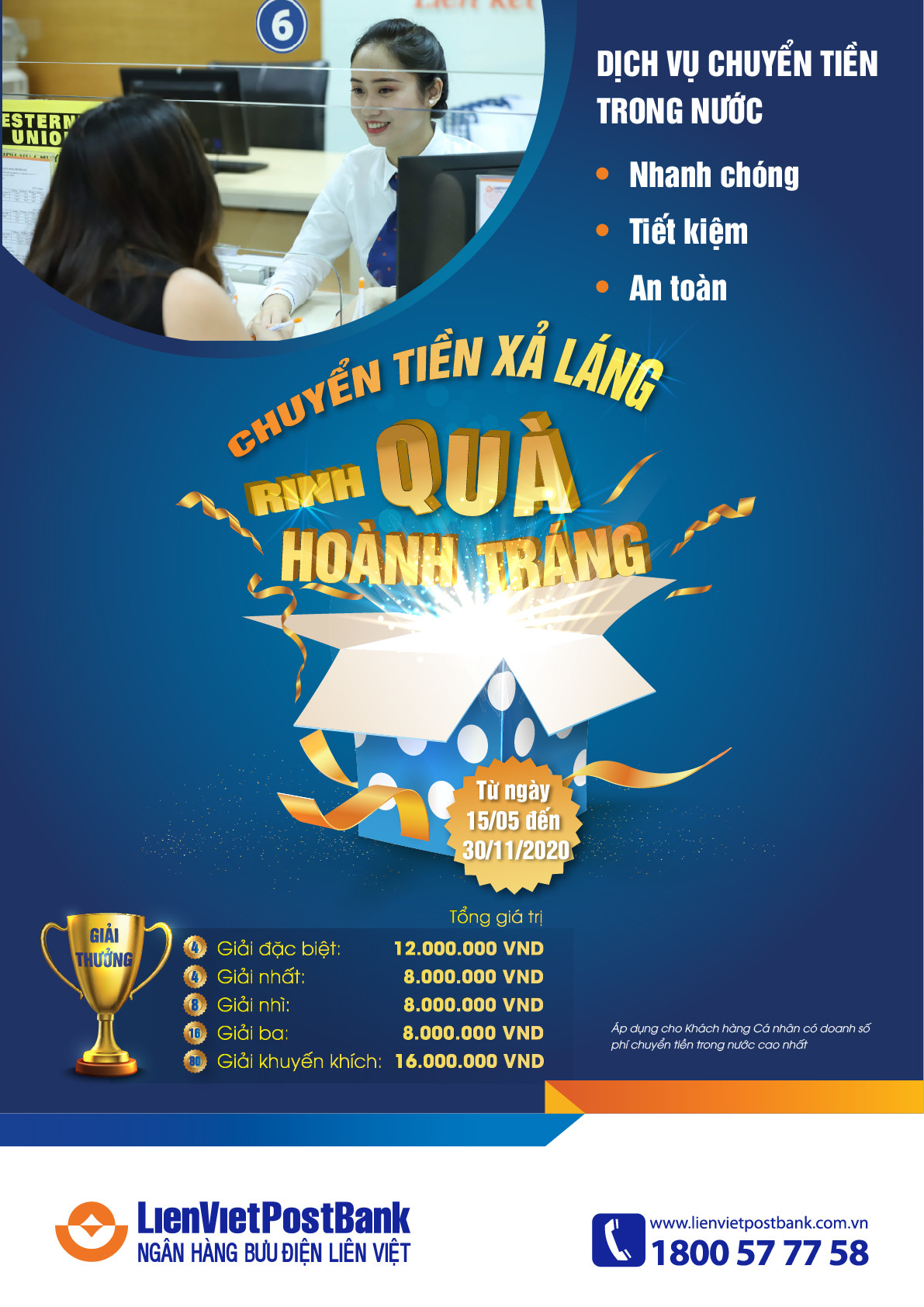 Chương trình “Chuyển tiền xả láng - Rinh quà hoành tráng” với cơ cấu giải thưởng hấp dẫn dành cho Khách hàng tại các Chi nhánh, Phòng Giao dịch Ngân hàng và các Phòng Giao dịch Bưu điện nâng cấp bao gồm: 04 giải Đặc biệt, 04 Giải Nhất, 08 Giải Nhì, 16 Giải Ba và 80 Giải Khuyến khích. Như vậy, càng chuyển tiền nhiều, khách hàng sẽ có nhiều cơ hội nhận được quà tặng với giá trị càng lớn. Phần quà tặng là tiền mặt sẽ được chuyển trực tiếp vào tài khoản thanh toán mở tại LienVietPostBank của khách hàng trúng thưởng.