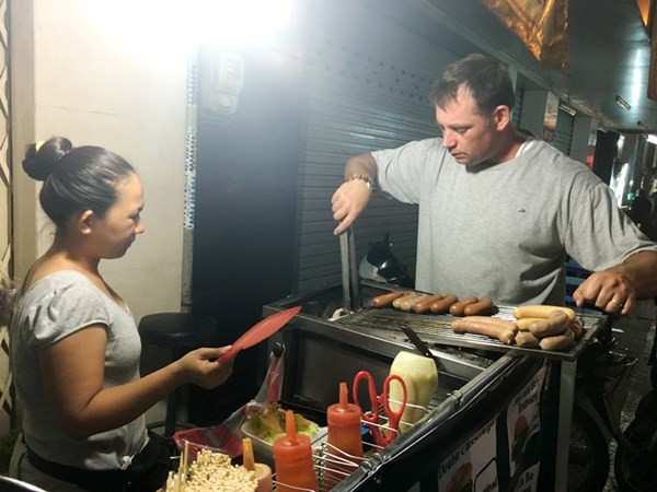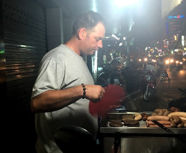 Giờ tan tầm, đi ngang vỉa hè trước nhà số 174 Dương Bá Trạc, quận 8, nhiều người rất ngạc nhiên trước hình ảnh một anh chàng nước ngoài cao lớn đang quạt phành phạch bếp than hồng và lui cui nướng xúc xích. Bên cạnh, một cô gái thấp bé, tay thoăn thoắt lấy những chiếc xúc xích còn nóng hổi, cắt ra cho vào những ổ bánh mì, trao cho khách.