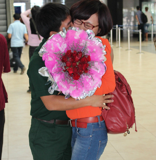 Phút giây gặp gỡ giữa sân bay Cam Ranh, Khánh Hòa, những thẹn thùng, rụt rè của đôi uyên ương nhường chỗ cho nỗi nhớ thương sau bao tháng ngày xa cách. Lần đầu tiên đôi trai gái yêu nhau mới được nắm chặt tay đi cạnh nhau.