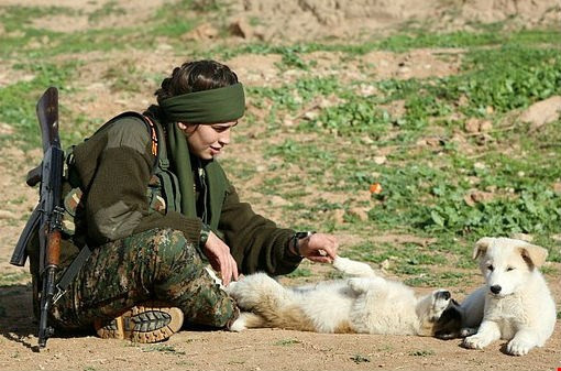 Lucia – một thành viên của tiểu đoàn – chơi đùa với những chú chó trong lúc rảnh rỗi tại một doanh trại ở thị trấn al-Qahtaniyah ngày 1/12/2015.