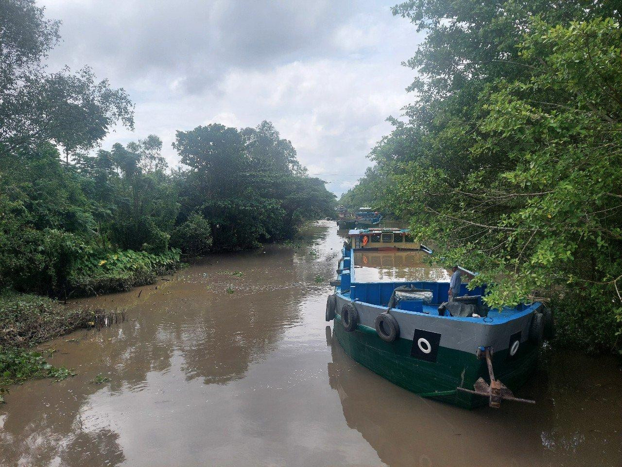 | Lòng sông nhỏ hẹp nên khi gặp các tàu ngược chiều, các tàu chở vật liệu phải nằm chờ |