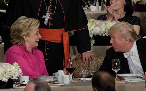 "Có vài khoảnh khắc rất cảm động", Đức Hồng Y Timothy Dolan, người ngồi giữa bà Clinton và ông Trump trong bữa tiệc Al Smith, một sự kiện từ thiện Cơ đốc giáo thường niên tại New York, Mỹ, tối 20/10, kể. "Tôi đã hỏi 'Chúng ta có thể cầu nguyện cùng nhau không? khi chúng tôi chờ được giới thiệu. Sau khi cầu nguyện một chút, ông Trump đã quay sang bà Clinton và nói 'bà biết đó, bà là một phụ nữ cứng rắn và tài năng'. Sau đó ông ấy nói 'cả chiến dịch (tranh cử) này là một trải nghiệm tốt, đúng là khó khăn".