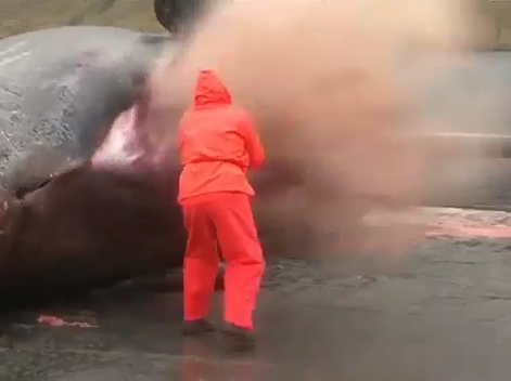 Đoạn video ghi cảnh một người đàn ông đang mổ bụng con cá voi thì bất ngờ phát nổ khiến người này hoảng sợ bỏ chạy.