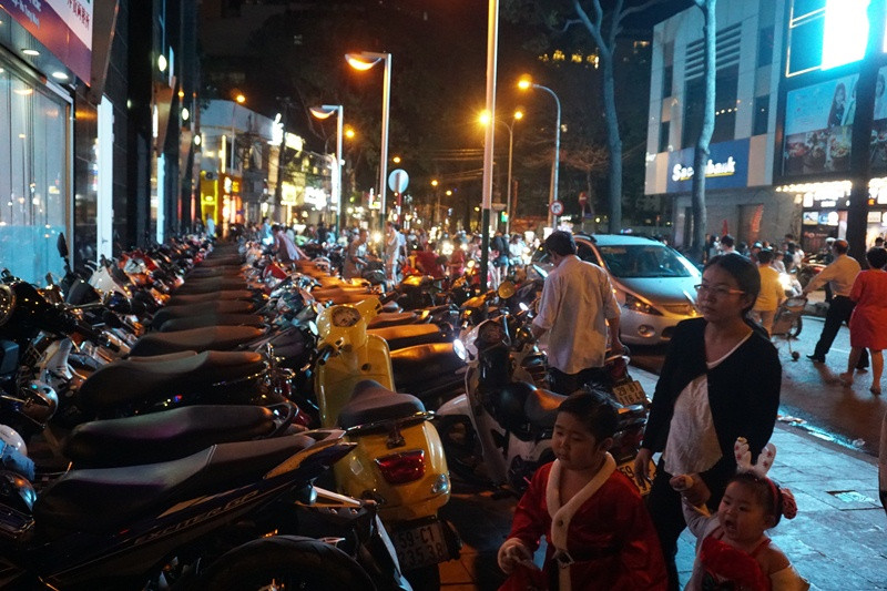 Khu vực "nóng" nhất là hai tuyến phố đi bộ Nguyễn Huệ và Bùi Viện luôn trong tình trạng ùn ứ, kẹt xe ở các giao lộ. Tuyến đường Phạm Ngũ Lão, Nguyễn Thái Học, Đề Thám, Cống Quỳnh dày đặc xe cộ qua lại khi người dân đổ về phố đi bộ Bùi Viện chơi Noel.
