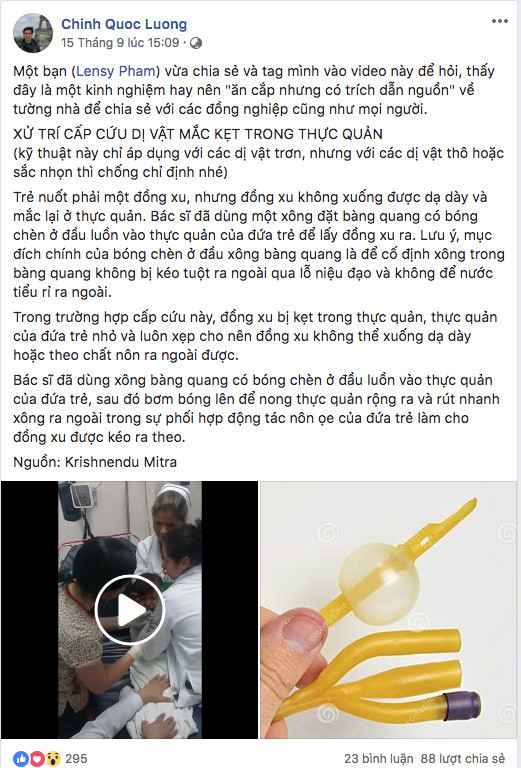 Không chỉ chia sẻ, một người dùng Facebook Chinh Quoc Luong còn có thêm những chia sẻ về cách xử trí cấp cứu dị vật mắc kẹt trong thực quản (kỹ thuật này chỉ áp dụng với các dị vật trơn, nhưng với các dị vật thô hoặc sắc nhọn thì chống chỉ định)