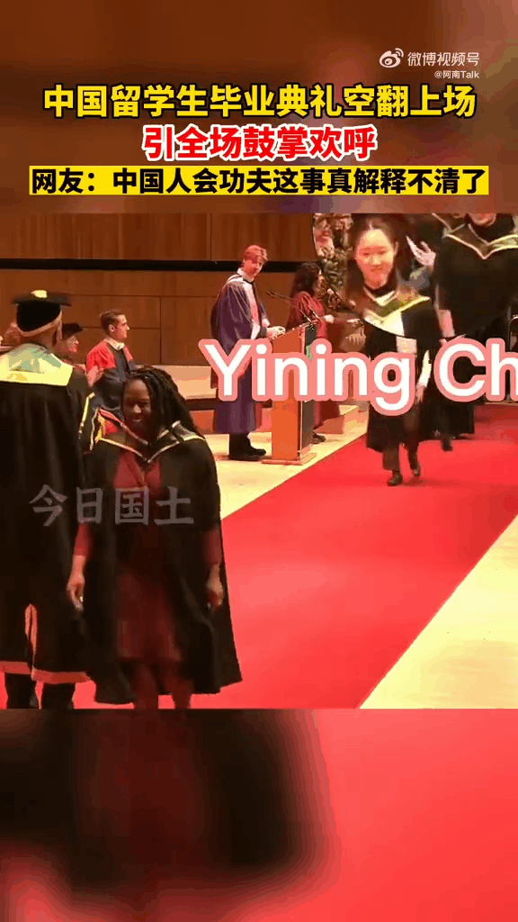Một nữ sinh Trung Quốc du học tại Anh đã khiến các bạn học và giáo viên nước ngoài kinh ngạc khi thực hiện động tác lật người ăn mừng "bất chấp trọng lực" tại lễ tốt nghiệp.
