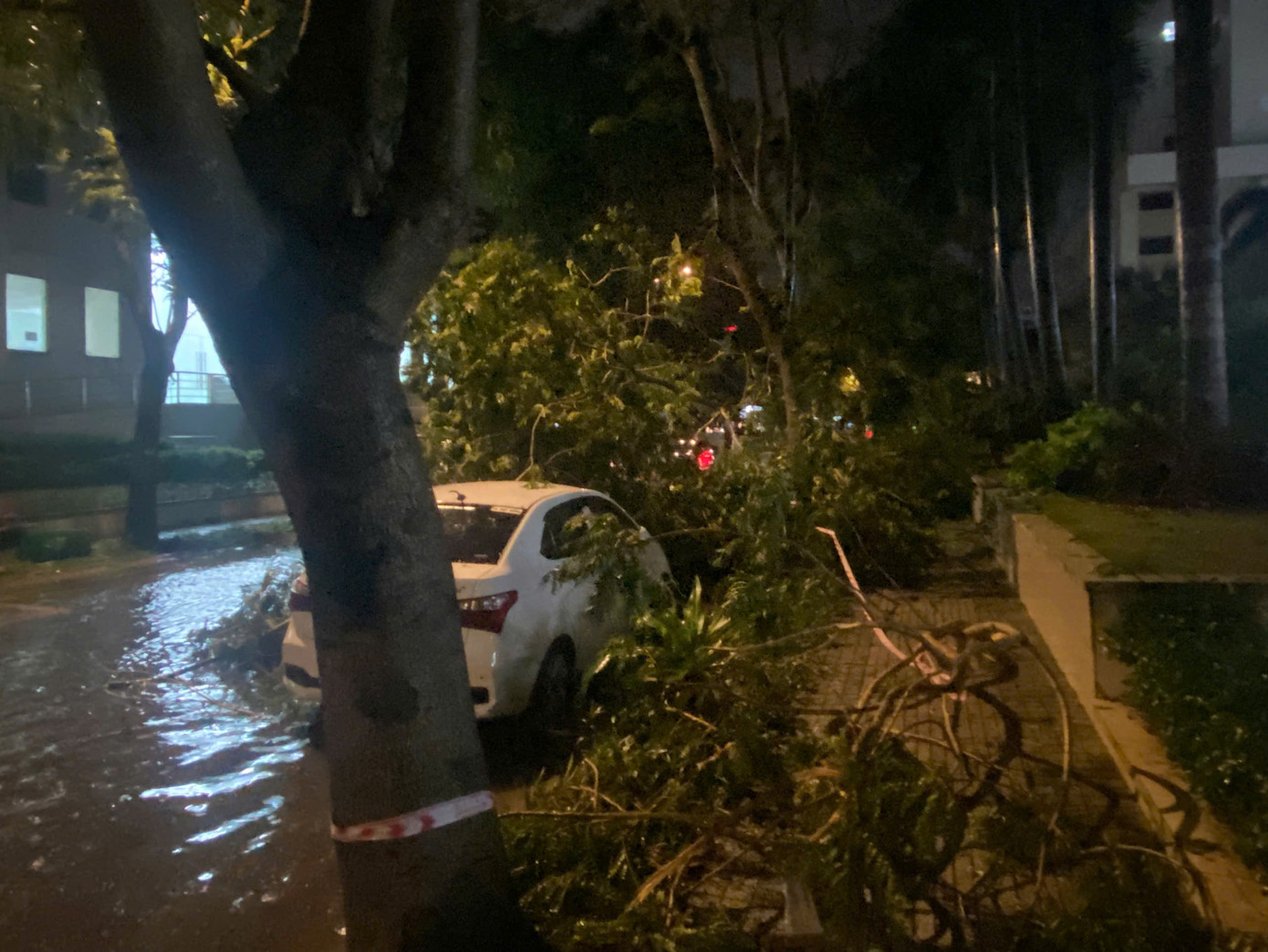 Chị H, cư dân sống tại lầu 6 Block C của chung cư, chia sẻ: "Trời mưa rất to, gió mạnh tạt nước mưa vào ban công nhà tôi và cả hành lang bên trong. Bên ngoài tôi nghe tiếng động lớn, cứ tưởng là sét, nhưng nhìn ra mới biết cây lớn trước chung cư đã bị gãy đổ."