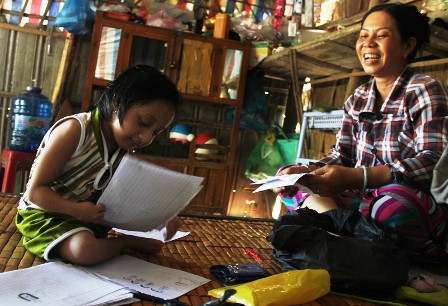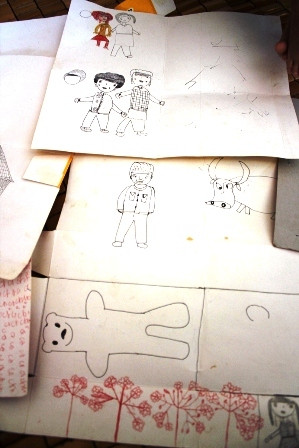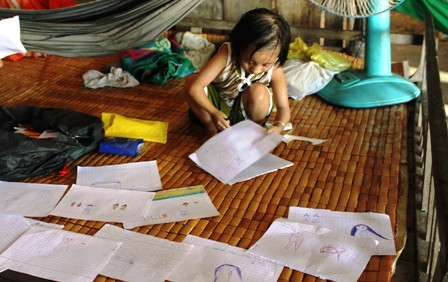 Bà Đinh Thị Diệp, nhà kế bên cho biết: “Con bé không được đi học, thân hình bé xíu như đứa bé vài tuổi mà có năng khiếu vẽ đẹp lắm. Bà ngoại nó mua quyển tập học sinh về nó vẽ mấy ngày là hết. Không có tiền mua tập bà đành cắt mấy tấm bìa trong bao thuốc lá, thùng chứa mỳ gói cho bé vẽ theo ý thích”.