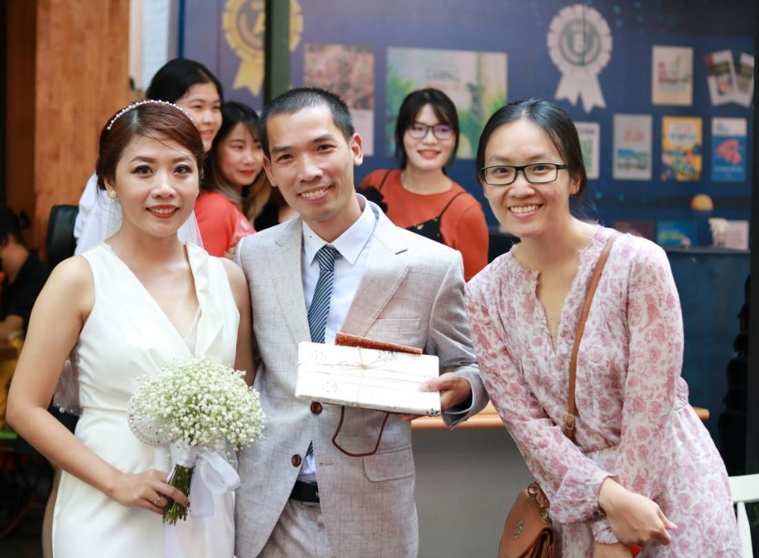 Trước ngày cưới, Tú Anh chỉ đăng trên trang cá nhân đôi dòng ngắn gọn gửi tới bạn bè: “Sáng Chủ nhật hai đứa mình ngồi ở Đường sách chờ mọi người tới chúc phúc và tặng sách...”. Và thế là đám cưới diễn ra đúng như ý nguyện của cô dâu chú rể. Bạn bè, các em nhỏ đã góp mặt và chúc phúc cặp đôi bằng những cuốn sách.