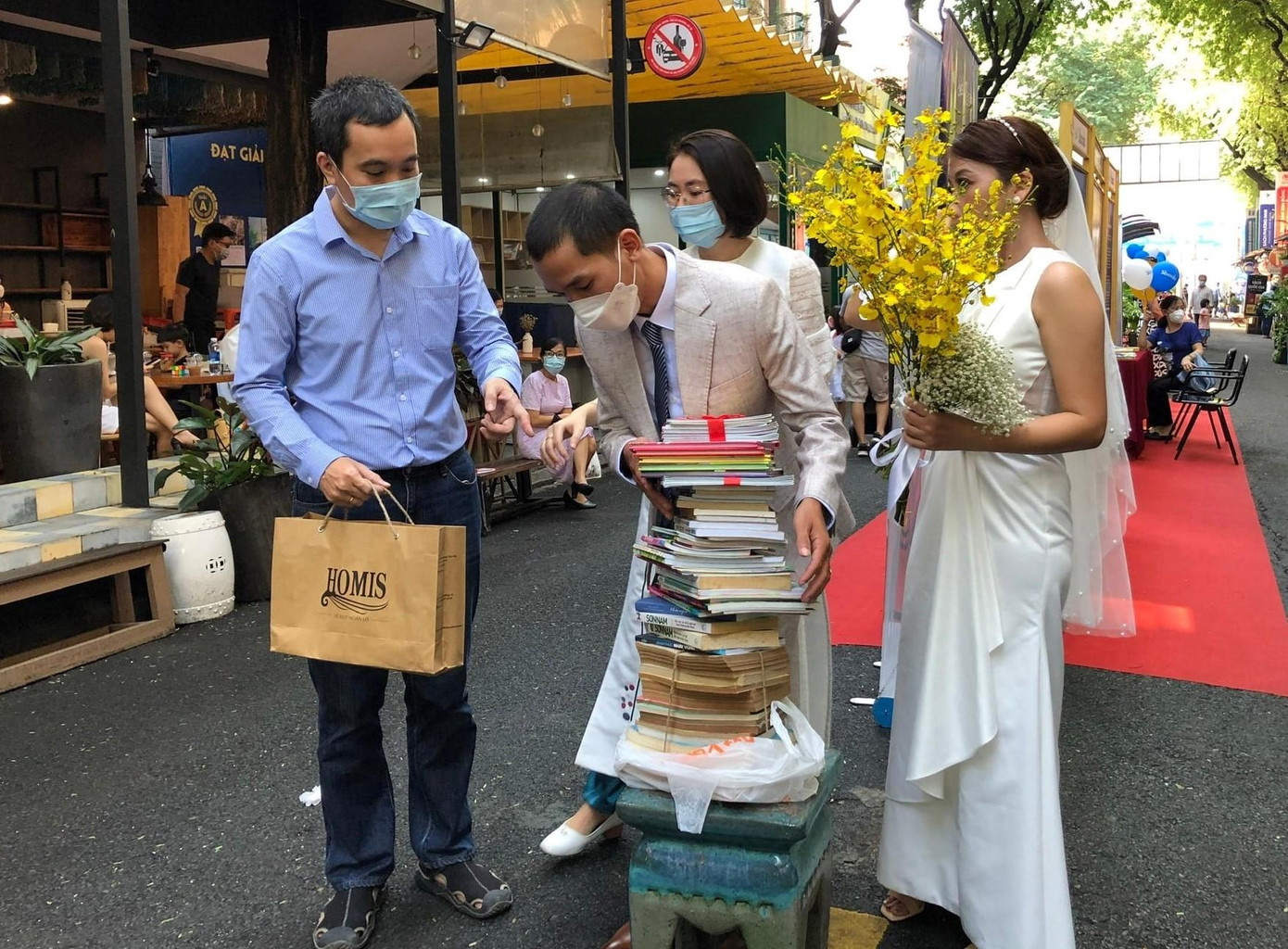 | Hơn 1.000 cuốn sách là phần quà đặc biệt mà cặp đôi đón nhận từ bạn bè trong lễ cưới tại Đường sách. |