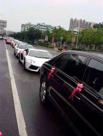 Không chỉ thế, đám cưới còn thể hiện sự giàu có xa hoa với dàn siêu xe và xe sang của các nhãn hiệu nổi tiếng như Ferrari, Lamborghini, Porsche, Maserati, Audi.