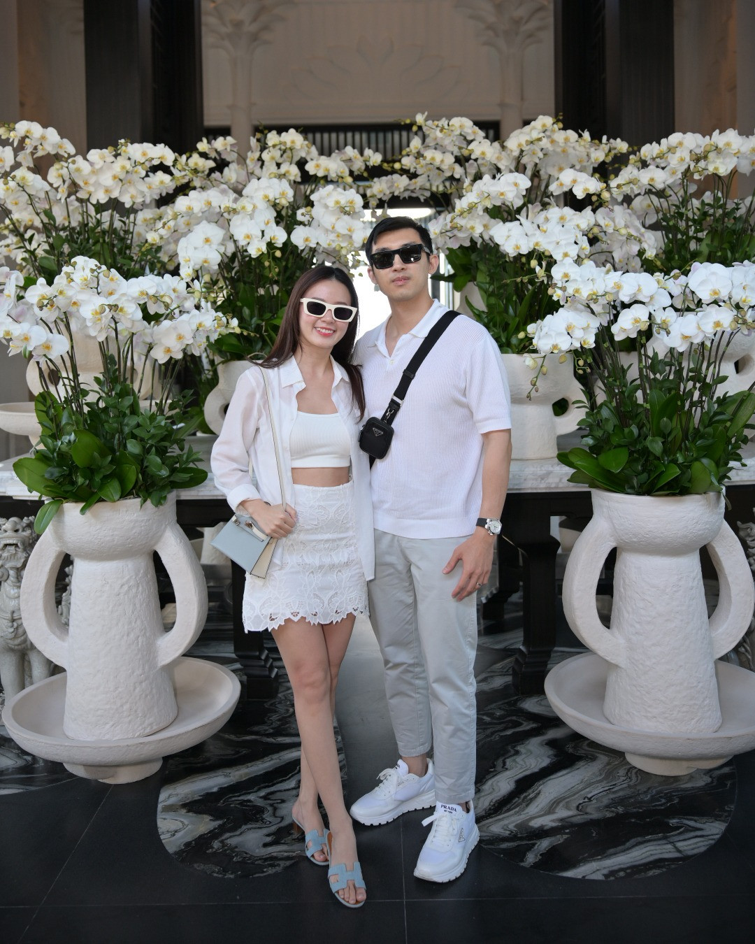 Thay cho style váy áo điệu đà nữ tính, Midu chọn trang phục khỏe khoắn hơn để tiện di chuyển nhiều. Và điểm nhấn chính là hai đôi sneaker mà hai vợ chồng sử dụng trong chuyến đi này. Hai người đều chọn giày màu trắng, dễ kết hợp nhiều loại trang phục khác nhau mà lên hình vẫn đẹp.