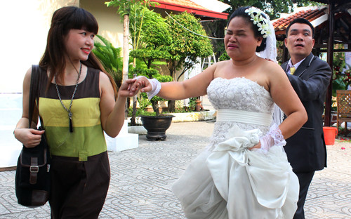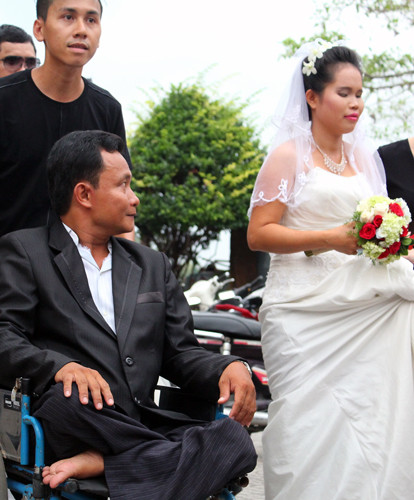 Anh Nguyễn Văn Dũng, quê Đồng Tháp, có đôi chân bị teo từ nhỏ cũng đưa vợ khiếm thị lên TP HCM tổ chức đám cưới. "Lúc trước không có điều kiện, hai đứa thương nhau về sống chung, giờ tui muốn có lễ cưới đường hoàng để vợ mình có váy cưới, có hoa, được là cô dâu đúng nghĩa", anh Dũng cười.