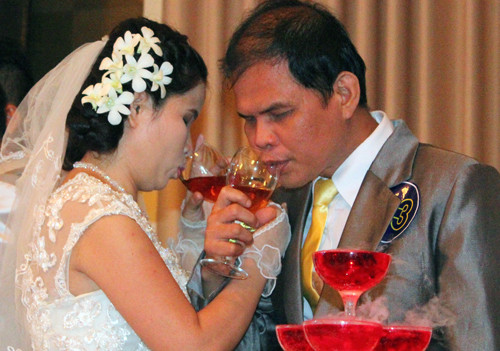 Sau khi uống ly rượu giao bôi, đôi uyên ương chính thức trở thành chồng vợ, nguyện ước lâu nay với nhiều cặp đôi đã thành hiện thực.