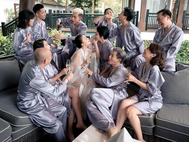 Người đẹp còn khoe những bức hình vui vẻ, thoải mái uống sâm-panh cùng hội bạn thân thiết. Mọi người mặc đồ ngủ cùng màu còn cô dâu Ngô Thanh Vân nổi bật với trang phục màu trắng tinh khôi. Có thể thấy, các cô gái đều đã trang điểm xong, chỉ cần "lên đồ" là có thể xuất hiện lộng lẫy ở đám cưới.